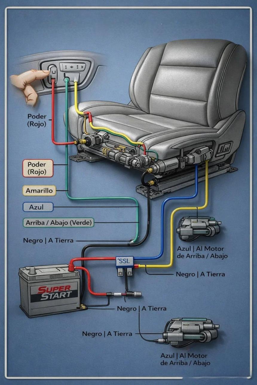 La imagen muestra el esquema de cableado de un asiento eléctrico de automóvil, indicando c...